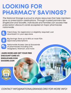 Grange members can save on prescription medications through free discount programs like SingleCare and GoodRx. These cards are easy to use, require no registration, and are accepted at major pharmacies nationwide. You can access them online at SingleCare.com or GoodRx.com to compare prices and download your free card. Benefits include savings of up to 80% on most FDA-approved prescriptions, whether or not you have insurance.
