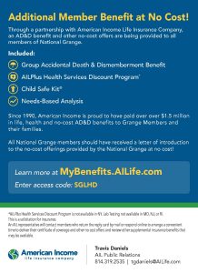Through a partnership with American Income Life Insurance Company, an AD&D benefit and other no cost offers are being provided to all members of National Grange.