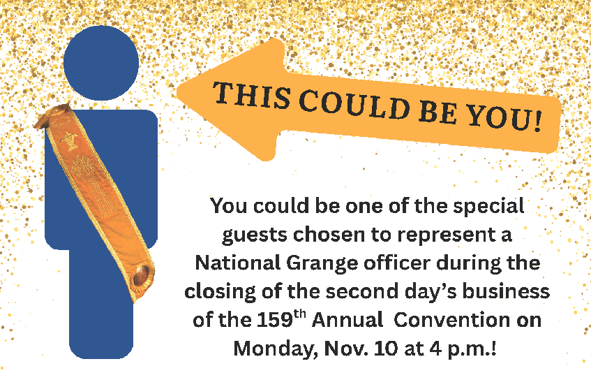Make a $25 donation to the Grange Foundation General Fund between June 21 to Nov. 2, 2025, and you will have the opportunity to receive a priceless experience — serving as a National Grange Officer during the closing ceremony.